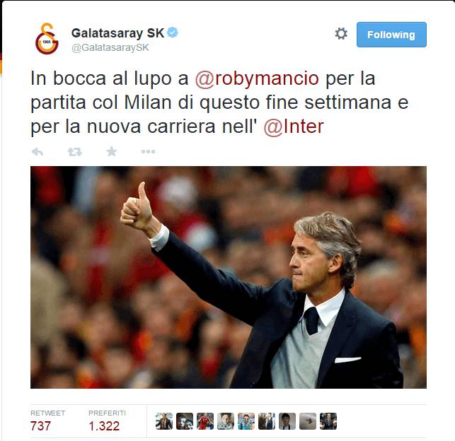 Il derby di Milano si avvicina, e a schierarsi con convinzione dalla parte dell’Inter è il Galatasaray. Il club di Istanbul ha infatti espresso i propri auguri al suo ex allenatore Roberto Mancini. Questo il messaggio su Twitter: ‘In bocca al lupo a Roberto Mancini per la partita col Milan di questo fine settimana e per la nuova carriera nell’Inter’. E’ stata poi la volta del nuovo allenatore nerazzurro, che ha contraccambiato gli auguri: ‘Grazie, auguro il meglio anche a voi’.