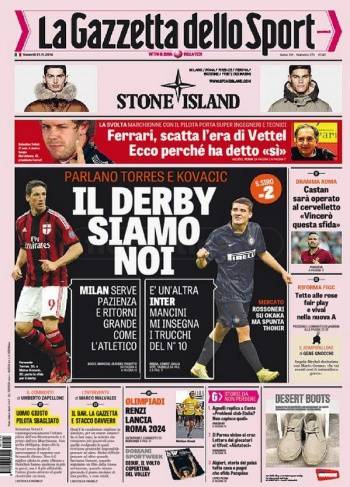 Sulla Gazzetta dello Sport doppia intervista con Torres e Kovacic che parlano del derby di domenica sera tra Milan e Inter.