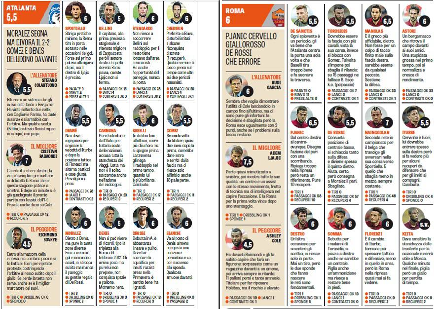 La Roma di Rudi Garcia batte in rimonta per 2-1 l’Atalanta di Stefano Colantuono dimostrando grinta e voglia di vincere. Un match avvincente ma anche nervoso in cui ha brillato la stella di Adem Ljajic. Nelle pagelle della Gazzetta Sportiva, infatti, l’attaccante serbo è il migliore dei giallorossi: un gol e un assist che regalano tre punti preziosi ai giallorossi. Se giocasse sempre così potrebbe diventare davvero fortissimo. Benissimo anche Miralem Pjanic, il vero cervello giallorosso: disegna l’azione del pari e fa pure dieci recuperi. Rimandato invece Daniele De Rossi: il suo errore sarebbe potuto costare caro alla Roma e da un giocatore della sua esperienza non è quello che ci si aspetta. Nell’Atalanta, invece, il migliore è Christian Raimondi che rimette a mettere in difficoltà i giallorossi a sinistra, dove soffrono di più in questa stagione. Promosso anche Moralez ma merita mezzo punto in meno perché si divora la rete del 2-2.