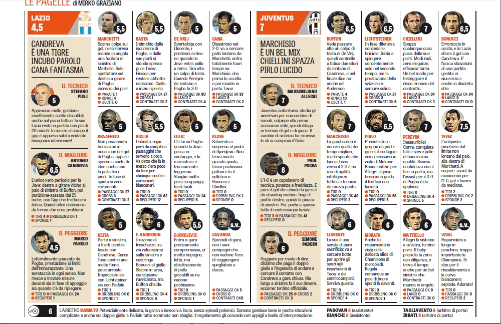 Una grandissima Juventus strapazza la Lazio All’Olimpico e vince 3-0 grazie alla doppietta di un fantastico Paul Pogba, ormai lanciato nell’olimpo dei migliori centrocampisti al mondo e ad una rete di Carlitos Tevez. Quella messa in campo da Massimiliano Allegri è una macchina perfetta che funziona ovunque: bene in difesa dove Chiellini spazza tutto, ancora meglio a centrocampo con un Pirlo lucidissimo e Pogba, il migliore in campo secondo la Gazzetta Sportiva, capace di dare forza, tecnica e classe all’intera manovra e in attacco dove l’Apache è sempre più uomo squadra. Bocciata, invece, la Lazio di Stefano Pioli: si salva solo Candreva ma da solo è difficile creare problemi alla retroguardia bianconera, Incubo Parolo mentre Cana è un fantasma.