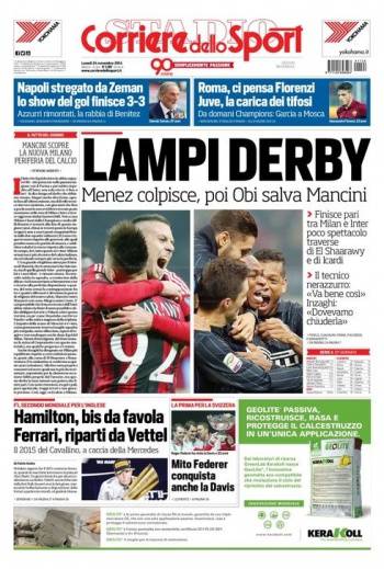 Il Corriere dello Sport parla invece di lampi nel derby tra Milan e Inter con i gol di Menez per i rossoneri e Obi per i nerazzurri.