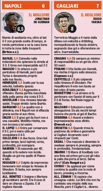 Il Cagliari riesce a strappare un punto al San Paolo quasi insperato vista come si era messa la partita. Il Napoli di Benitez vinceva due a zero con i gol di Higuain e Inler, il pareggio del Cagliari con l’uno-due Ibarbo-Farias, i padroni di casa nuovamente in vantaggio con De Guzman e raggiunti dallo scatenato Farias, autore di una partite eccellente e migliore in campo del match. Bene anche De Guzman, mentre male Hamsik e Koulibaly che ha sbagliato diverse situazioni. Voti e pagelle della Gazzetta dello Sport.