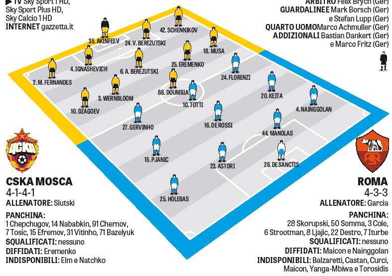 La Roma arriva a Mosca con diversi infortunati e indisponibili tanto che Rudi Garcia ha in mente un cambiamento di ruolo per Radja Nainggolan. Secondo quanto riportato dalla Gazzetta dello Sport, il centrocampista belga potrebbe giocare da terzino destro visto che mancano sia Maicon che Torosidis. In difesa coppia centrale obbligatoria Manolas-Astori con Holebas a sinistra: a centrocampo invece De Rossi centrale con Keita e Pjanic mentre in attacco tridente con Florenzi, Totti e Gervinho. Il Cska Mosca punterà sull’ivoriano Doumbia, pericolosissimo in area di rigore e sull’estro di Dzagoev.