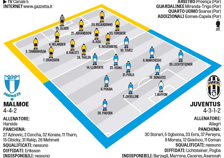 La Juventus questa sera giocherà nel gelo di Malmoe contro la formazione di casa e cercherà di portare a casa tre punti importanti per la qualificazione agli ottavi di finale. Massimiliano Allegri ha qualche problema di formazione soprattutto sulla fascia sinistra visto che Ogbonna ed Evra non stanno bene e Asamoah è fuori per infortunio, per questo spazio a Padoin terzino sinistro. A centrocampo tocca a Vidal giocare come trequartista dietro la coppia d’attacco Llorente-Tevez. I padroni di casa giocheranno con un lineare 4-4-2 con l’esperto Rosenberg in attacco. Le probabili formazioni secondo la Gazzetta dello Sport.