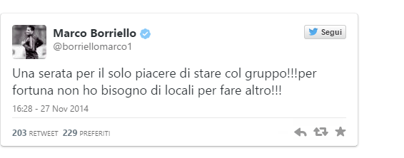 ROMA BORRIELLO – La stampa russa, dopo il pareggio di Champions fra Cska e Roma, aveva immortalato alcuni giocatori giallorossi all’entrata di uno strip club in quel di Mosca. Fra questi c’era pure Marco Borriello. Su Twitter, l’attaccante si è così difeso: ‘Una serata per il solo piacere di stare col gruppo!!! Per fortuna non ho bisogno di locali per fare altro!!!‘. Basterà per placare la polemica? Di seguito il tweet del giocatore.