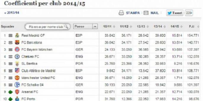 Dopo il turno di Champions League e di Europa League, la Uefa, attraverso il proprio sito ufficiale, ha reso pubbliche le nuove posizioni del Ranking per club. Il Milan, per la mancata partecipazione alle coppe europee, continua a perdere posizioni ma resta primo tra le italiane. Salgono, invece, la Juventus e la Roma, rispettivamente 21esima e 52esima. Bel passo in avanti, invece, della Fiorentina che scala ben cinque posizioni nella graduatoria generale. Ecco la classifica:
