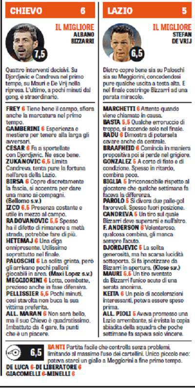 La Lazio di Stefano Pioli non decolla. Al Bentegodi raccoglie un solo punto contro il Chievo Verona di Maran. I veneti, al quarto risultato utile consecutivo ringraziano il portiere Bizzarri, il migliore tra i suoi in base alle pagelle della Gazzetta Sportiva. Quattro gli interventi decisivi del 37enne: su Djordevic e Candreva nel primo tempo, su Mauri e De Vrij nella ripresa. L’ultimo, a pochi minuti dal fischio finale, è straordinario. Nella Lazio, invece, il migliore in campo è stato De Vrij: copre bene sia su Paloschi che su Meggiorini e nel finale costringe anche Bizzarri ad una parata miracolosa. Ecco i voti della Gazzetta:
