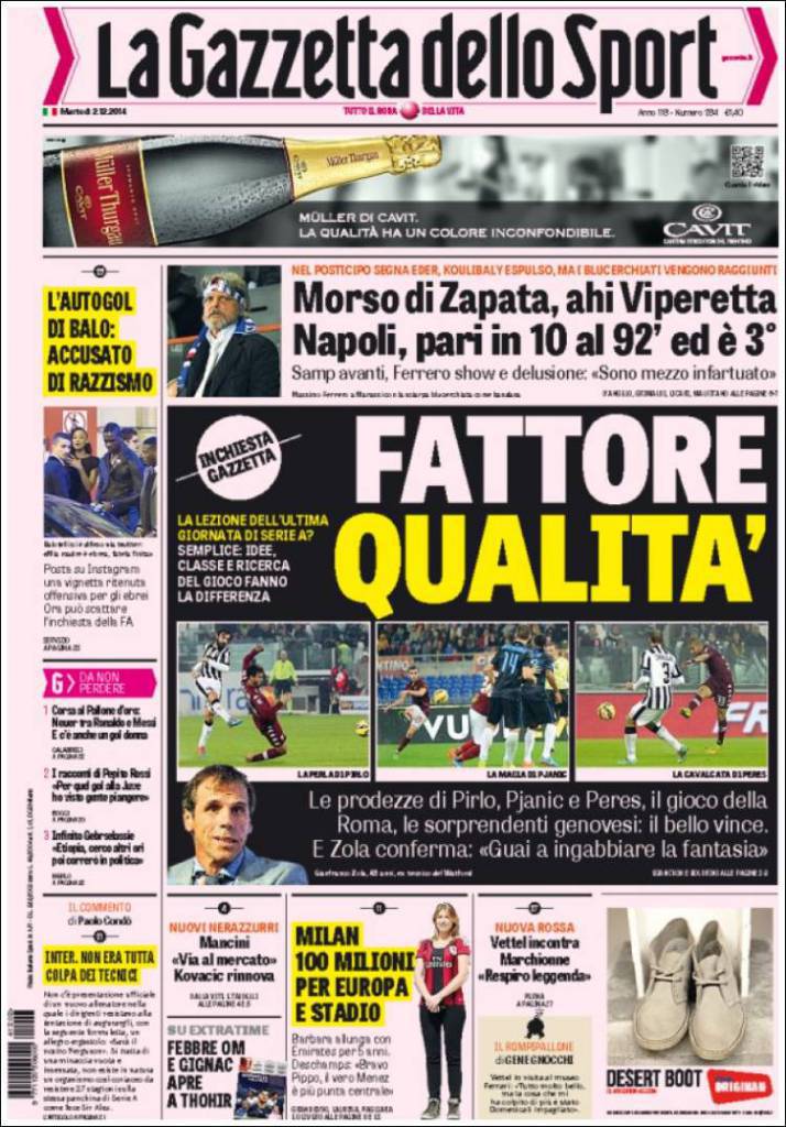Un’inchiesta della Gazzetta dello Sport, in edicola nel numero di oggi, mette in risalto la qualità dei calciatori della Serie A, essenziale per permettere una rapida risalita del nostro campionato.