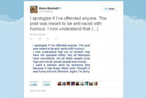 Mario Balotelli torna sui suoi passi e, tramite il profilo Twitter, chiede scusa a tutti dopo le polemiche sollevate dalla pubblicazione della foto del personaggio SuperMario accompagnata dalla seguente didascalia “salta come un nero e afferra soldi come un ebreo”. Frase che non è piaciuta a nessuno al punto che la FA, la federazione inglese, ha deciso di aprire un’inchiesta. Questa mattina, però, l’attaccante del Liverpool torna sui suoi passi e chiede scusa:
