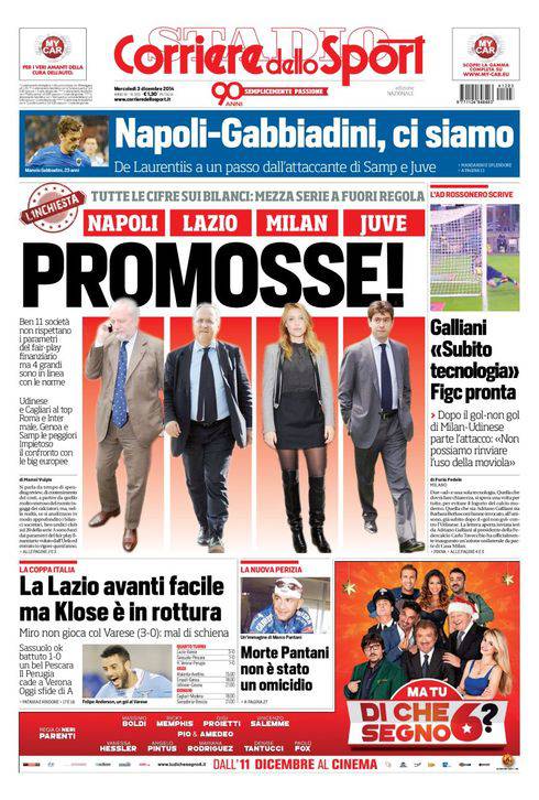 Il Corriere dello Sport parla invece delle società italiane che sono in regola con i bilanci, promesse Juventus, Lazio, Napoli e Milan.