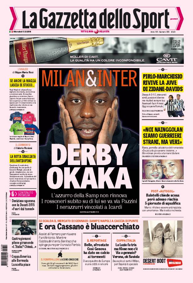La Gazzetta dello Sport parla del derby milanese tra Milan e Inter per Stefano Okaka, attaccante della Sampdoria.