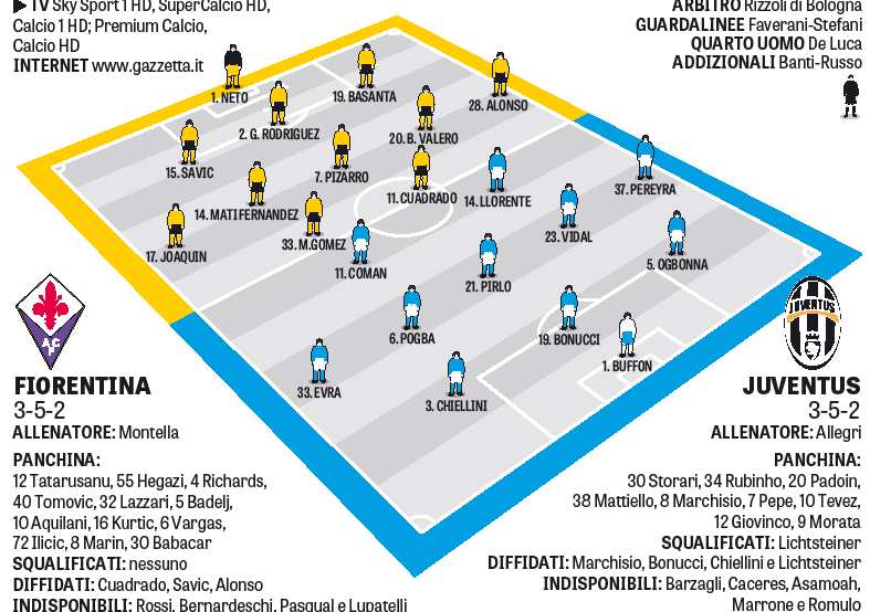 Questa sera anticipo della 14esima giornata di campionato in Serie A con il super match tra Fiorentina e Juventus che si giocherà al Franchi. Partita che vale tantissimo per entrambe le formazioni vista anche la nota rivalità tra le due tifoserie. Fiorentina con il 3-5-2 con Cuadrado e Gomez in attacco, centrocampo con Joaquin e Alonso esterni, Mati Fernandez, Pizarro e Borja Valero centrali, Basanta, Rodriguez e Savic davanti a Neto. Dall’altra parte Allegri decide di preservare Tevez, accanto a Llorente giocherà il giovane Coman, con Evra e Pereyra larghi, Pogba, Pirlo e Vidal centrali, difesa a tre con Chiellini, Bonucci e Ogbonna davanti a Buffon. Le probabili formazioni secondo la Gazzetta dello Sport.