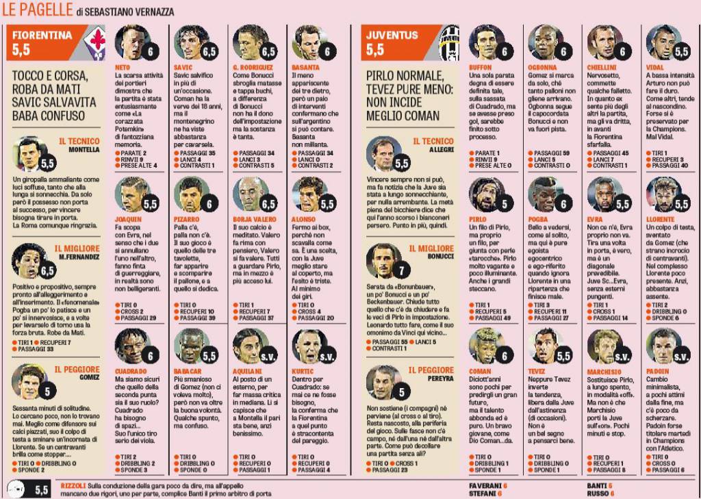 Finisce zero a zero il match tra Fiorentina e Juventus, poco spettacolo e tante botte in campo. Partita tesissima che evidentemente ha frenato il bel gioco di entrambe le squadre. Partita brillante di Leonardo Bonucci, il migliore della Juventus e anche del match: il centrale difensivo bianconero stoppa ogni tentativo di avanzata della viola e in particolare di Mario Gomez, bomber di Montella. Il centravanti tedesco è il peggiore della Fiorentina, poco mobile, non riesce mai a rendersi pericoloso, davvero una delusione. Nella Juventus non ingrana Pereyra che non sostituisce al meglio Lichsteiner. Voti e pagelle della Gazzetta dello Sport.