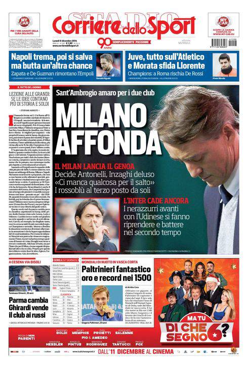 Il Corriere dello Sport parla delle due squadre milanesi che perdono entrambe: il Milan contro il Genoa, l’Inter contro l’Udinese.