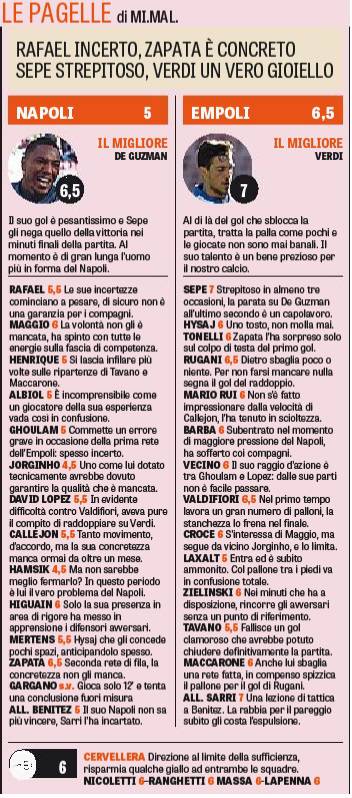 Il Napoli esce tra i fischi del San Paolo dopo il due a due contro l’Empoli. I partenopei rischiano grosso contro una squadra, quella di Sarri, ben organizzata e piena di talento. Come quello di Verdi, giovane calciatore di scuola Milan che realizza un gol sontuoso e soprattutto regala perle importanti. Nel Napoli invece solito problema Hamsik, ormai fuori dal gioco di Benitez. Pesano anche le incertezze di Rafael che non è sicuro tra i pali e non incute sicurezza alla difesa. Voti e pagelle della Gazzetta dello Sport.