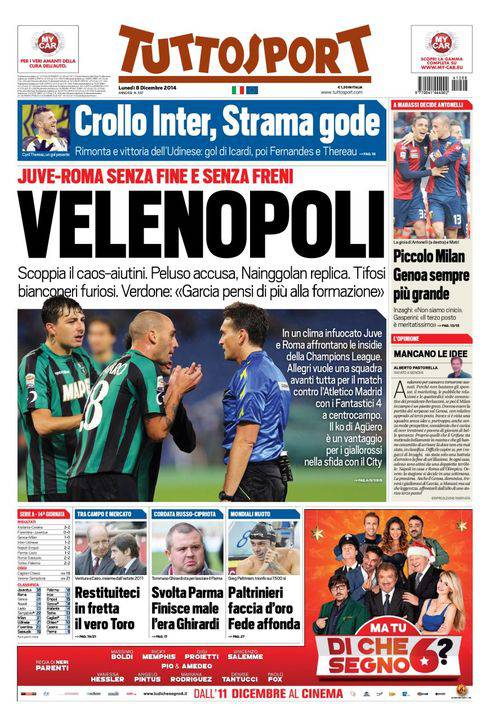 Tuttosport – Velenopoli 08/12/2014 di Ruggieri Su Tuttosport si parla delle polemiche a distanza tra Peluso e Nainggolan sull’arbitraggio di Roma-Sassuolo di sabato pomeriggio. Samuele Roccati