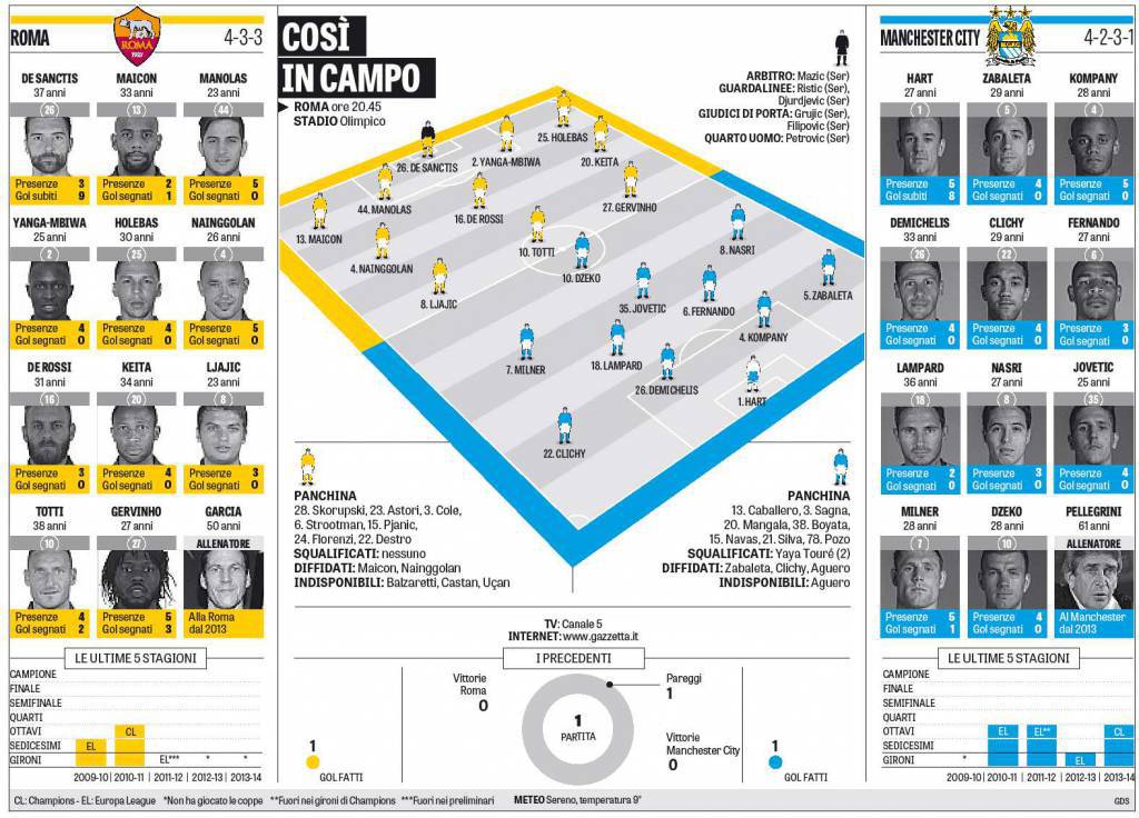 Partita importantissima per la Roma di Garcia che dovrà vincere contro il Manchester City per volare agli ottavi di finale di Champions League. Non sarà facile per Totti e soci visto che la rosa dei Citizens è davvero importante anche senza l’infortunato Aguero. Garcia sceglie Keita al posto di Pjanic per dare maggiore spessore internazionale, in attacco Ljajic accanto a Totti e Gervinho. Nel City spauracchio Dzeko in attacco con Milner, Jovetic e Nasri in attacco, a centrocampo Lampard al posto dello squalificato Touré. Le probabili formazioni secondo la Gazzetta dello Sport.