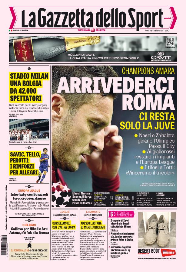 La Gazzetta dello Sport parla della Roma che perde due a zero in casa contro il City ed esce fuori dalla Champions League.