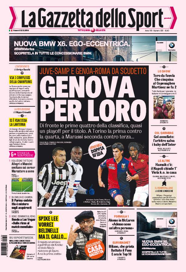 Gazzetta dello Sport – Genova per loro 12/12/2014 di Ruggieri La prossima giornata di campionato vede una doppia sfida importante per Sampdoria e Genoa che giocheranno contro Juventus e Roma. Samuele Roccati