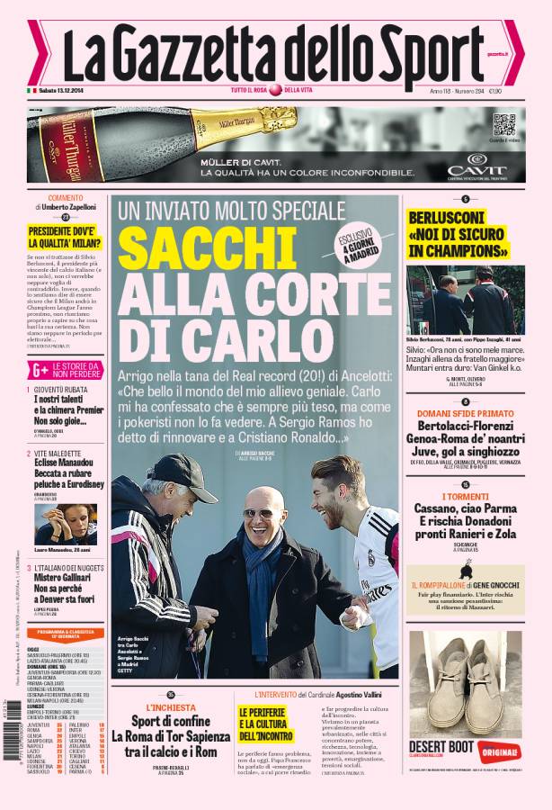 La Gazzetta dello Sport parla di Arrigo Sacchi che è volato a Madrid per quattro giorni e ha incontrato il suo allievo Ancelotti.