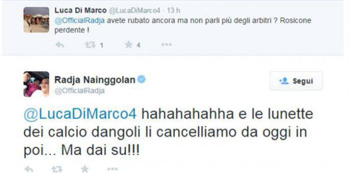 Tra i calciatori della Roma più attivi sui social network c’è sicuramente il centrocampista belga Radja Nainggolan che, ieri, ha regalato tre punti preziosi alla squadra di Garcia con il suo splendido gol. Su Twitter, un tifoso della Juventus ha punzecchiato il centrocampista giallorosso scrivendo: “@OfficialRadja avete rubato ancora ma non parli più degli arbitri? Rosicone perdente!”. La reazione di Nainggolan non si è fatta attendere: “@LucaDiMarco4 hahahahahha e le lunette dei calcio dangoli li cancelliamo da oggi in poi… Ma dai su!!!