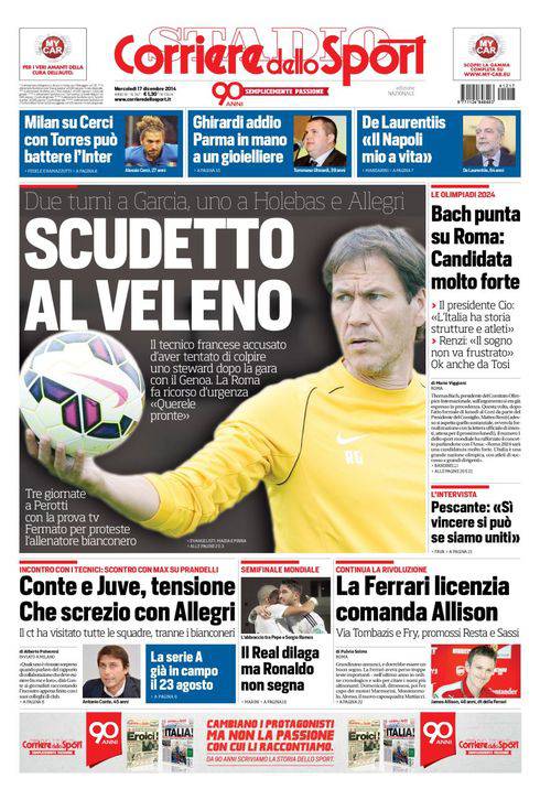 Sul Corriere dello Sport c’è spazio per le polemiche riguardanti le squalifiche di Garcia, Holebas e Allegri.