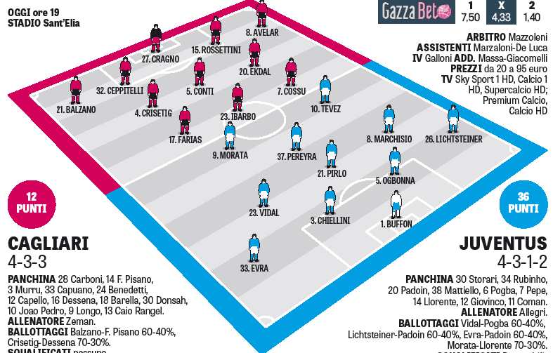 La Juventus di Massimiliano Allegri sarà impegnata quest’oggi nell’anticipo della 16esima giornata di campionato sul campo del Cagliari di Zeman. Partita che sulla carta può dare grande spettacolo visto che il boemo sicuramente vorrà attaccare i bianconeri. Il Cagliari ritrova Cossu e in attacco giocherà con Ibarbo e Farias. Nella Juventus invece piccolo turnover in vista della Supercoppa contro il Napoli, fuori Pogba e dentro Pereyra come trequartista mentre in attacco ci sarà Alvaro Morata al posto di Llorente assieme a Tevez. Le probabili formazioni secondo la Gazzetta dello Sport.