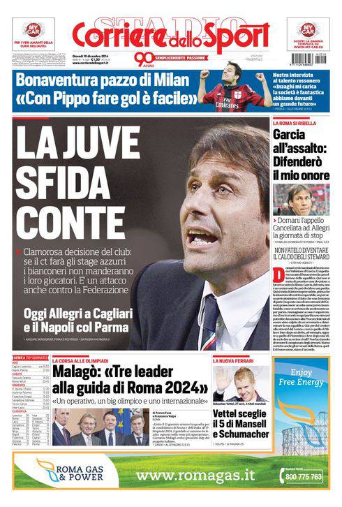Sul Corriere dello Sport parla della Juventus che ha sfidato il c.t. Conte in vista dello stage di febbraio.