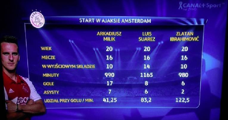 FOTO MILIK – Arkadiusz Milik non è solo uno dei tanti ragazzi di belle speranze che milita nell’Ajax. L’attaccante polacco, classe 1994, sta impressionando l’Europa calcistica a suon di gol. I dati raccolti fanno impressione e parlano chiaro: Milik, a 20 anni, con la maglia biancorossa, ha fatto meglio di illustrissimi predecessori fra cui Luis Suarez e Zlatan Ibrahimovic. Entrambi, alla stessa età del ragazzo, avevano giocato con i Lancieri più minuti e segnato meno. Come si vede dalla grafica, Milik ha totalizzato 17 centri in 16 partite; Ibra, quando militava nell’Ajax e aveva 20 anni, si fermò a 6 in altrettanti incontri disputati mentre Suarez a 8 nello stesso numero di match giocati. Milik domina anche in quanto ad assist: 7 contro i 6 di Suarez e i 2 dello svedese. Che sia nata una nuova stella? I dati, intanto, sono straordinari.