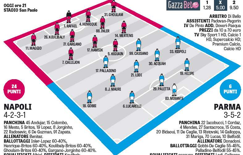Anche il Napoli anticipa oggi il 16esimo turno di campionato contro un Parma che ha disperato bisogno di punti. I ducali infatti dovranno smuovere la classifica per evitare di sentirsi già in Serie B. Il Napoli dovrà fare a meno dello squalificato Albiol, al posto dello spagnolo dovrebbe giocare Henrique con Koulibaly. A centrocampo confermato Inler che giocherà con Gargano mentre in attacco niente turnover: Mertens a sinistra, Hamsik al centro e Callejon a destra, in attacco Higuain. Il Parma invece punterà su Palladino in attacco che giocherà accanto a Cassano. Le probabili formazioni secondo la Gazzetta dello Sport.