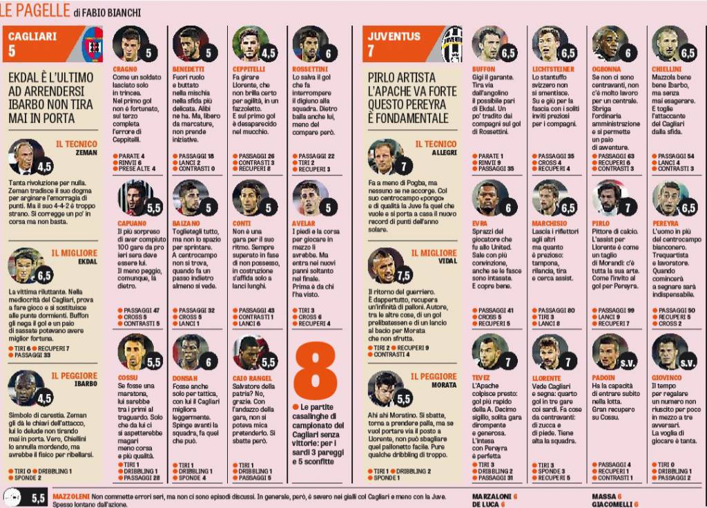 Il Cagliari di Zeman si arrende subito contro la Juventus di Allegri a cui basta un tempo per stendere con tre gol i sardi. Inutile il gol della bandiera di Rossettini che serve solo ad alleggerire il passivo per i sardi. Nella Juventus ritorna un grande Vidal autore di un gol e di una prestazione maiuscola, meno positiva la prova di Morata che non riesce a trovare la via del gol. Positive le prestazioni di Llorente e Tevez entrambi in rete e pronti per giocare da titolare a Doha in Supercoppa. Voti e pagelle della Gazzetta dello Sport.