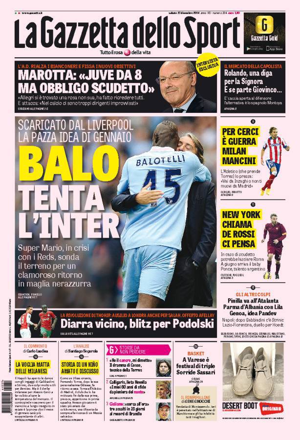 La Gazzetta dello Sport parla di Balotelli che vorrebbe tornare all’Inter dopo la bocciatura di Rodgers, manager del Liverpool.