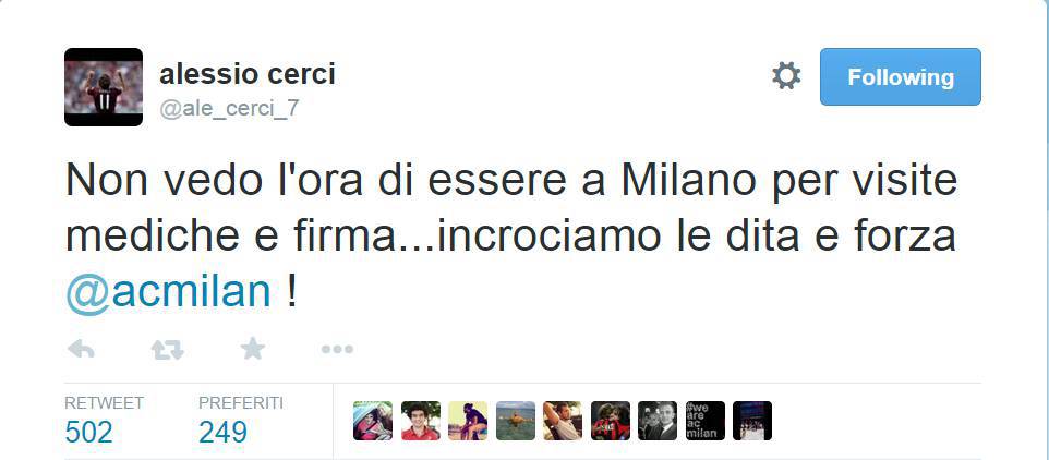 A stemperare tutte le tensioni di questi giorni è stato lo stesso Alessio Cerci. L’ormai ex giocatore dell’Atletico Madrid è stato infatti al centro di una trattativa, quella per portarlo al Milan, molto discussa, con dichiarazioni e smentite che hanno rischiato di compromettere il suo rientro in Italia.