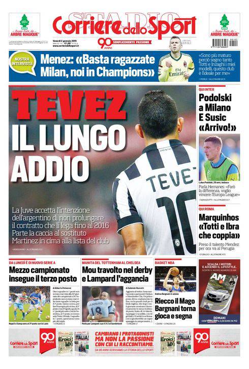 Sul Corriere dello Sport si parla di Tevez che è pronto a lasciare la Juventus al termine del contratto in scadenza nel 2016.