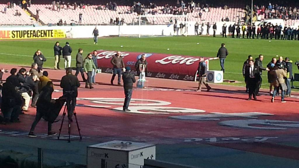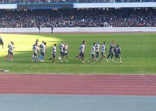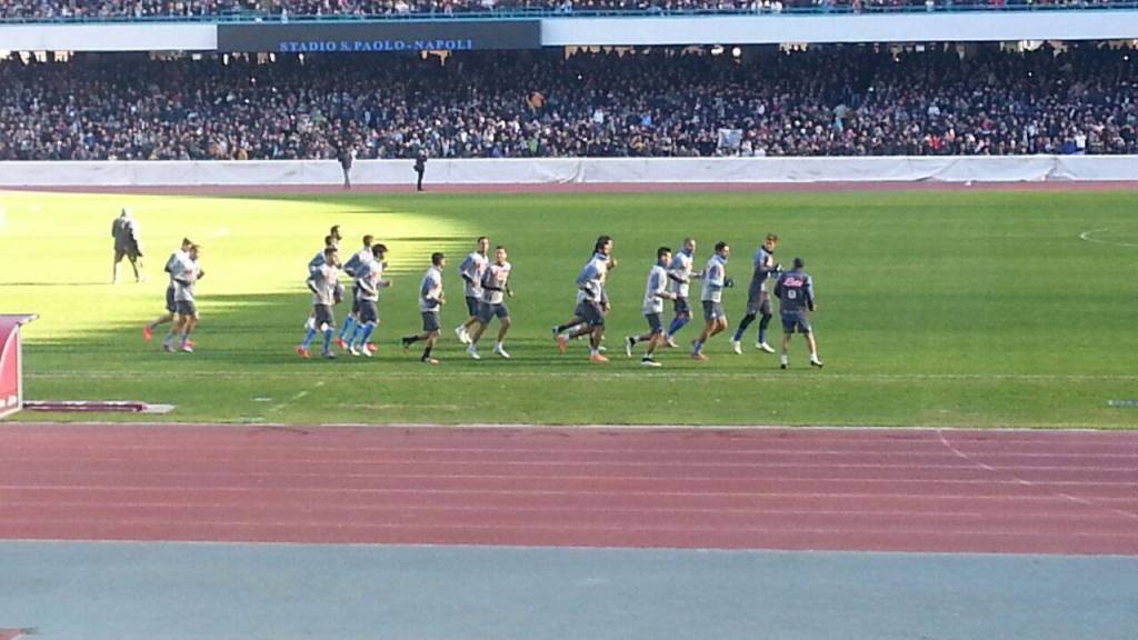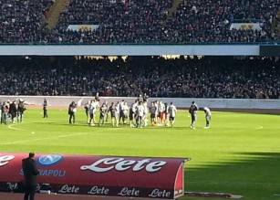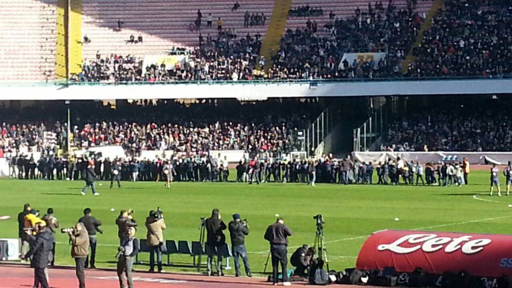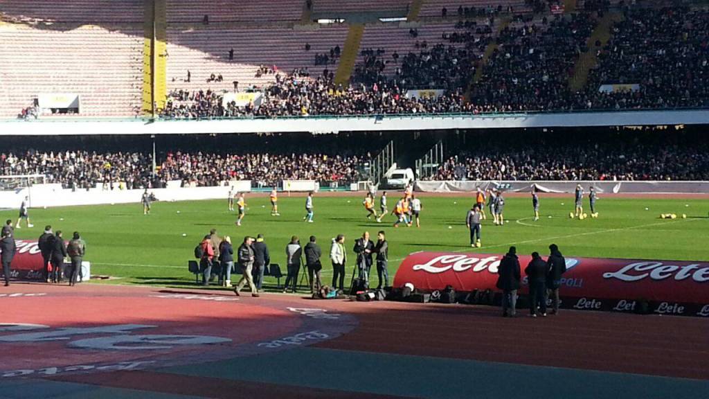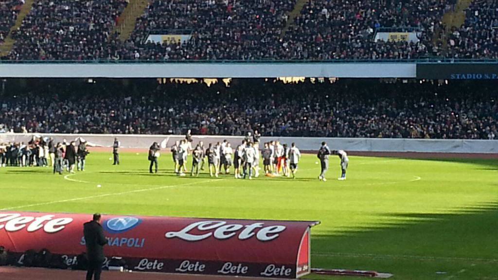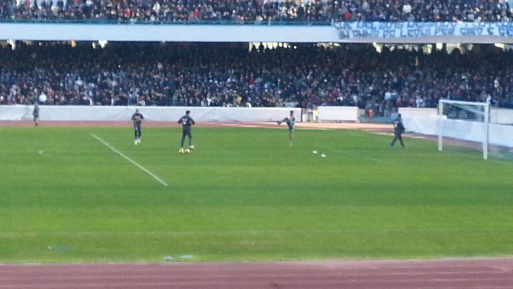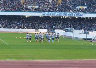 La parte più calda della tifoseria partenopea, inoltre, ha risposto alle parole di Aurelio De Laurentiis il quale ha affermato che l’ambiente napoletano non è ancora pronto per la vittoria dello scudetto, con cori inneggianti al fatto “siamo partenopei con un sogno nel cuor, vogliamo il tricolor”.