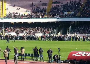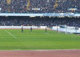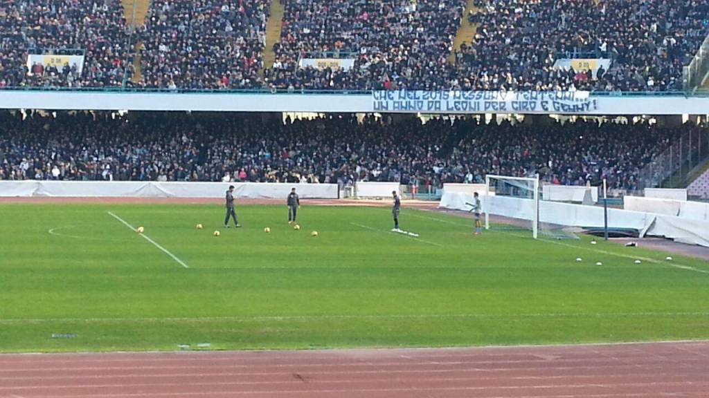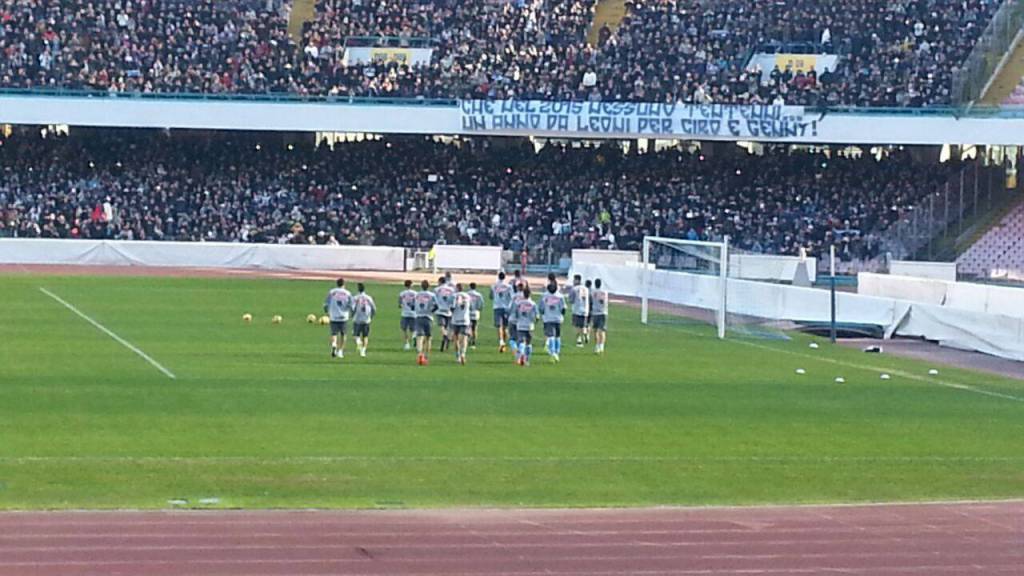 Giornata di festa per il Napoli e i tifosi napoletani che questa mattina si sono ritrovati al San Paolo per assistere all’allenamento a porte aperte della squadra azzurra agli ordini di Rafa Benitez. In un clima di festa generale, i tifosi azzurri hanno l’occasione di abbracciare Higuain, Benitez e tutti gli eroi di Doha che hanno strappato la Supercoppa Italiana alla Juventus. Un clima di festa, però, rovinato da chi inneggia alla violenza, anche dopo l’appello della mamma di Ciro Esposito durante il concerto di Capodanno di Gigi D’Alessio. Un gruppo di tifosi, infatti, ha esposto uno striscione vergognoso che dice: “Che nel 2015 nessuno tentenni… Un anno da leoni per Ciro e Genny”.