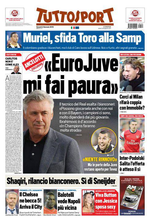 Tuttosport – Ancelotti ‘Euro Juve mi fai paura’ 02/01/2015 di Ruggieri Intervista esclusiva a Carlo Ancelotti da parte di Tuttosport che parla della Juventus impegnata in Champions League. Samuele Roccati