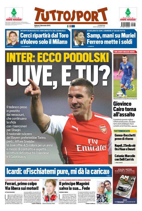 Su Tuttosport si parla del colpo Inter con l’arrivo di Podolski dall’Arsenal, i bianconeri pronti a prendere Sneijder.