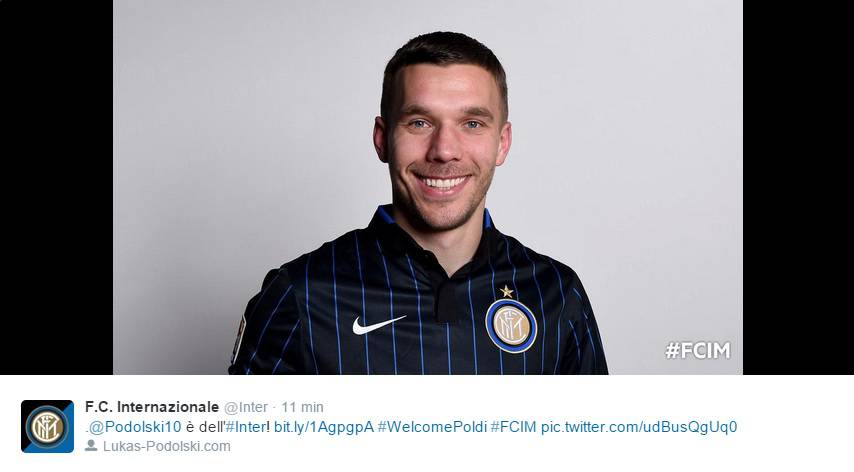 Lukas Podolski è ufficialmente un giocatore dell’Inter. L’attaccante tedesco giocherà in prestito nella squadra nerazzurra in prestito fino al termine della stagione. Il club meneghino ha ufficializzato il suo arrivo sia tramite il proprio profilo Twitter sia sul sito: “F.C. Internazionale comunica l’arrivo dall’Arsenal FC di Lukas Podolski con la formula del trasferimento temporaneo fino al giugno 2015. Il club nerazzurro desidera ringraziare la FIGC per la proficua collaborazione e la velocità di intervento”.