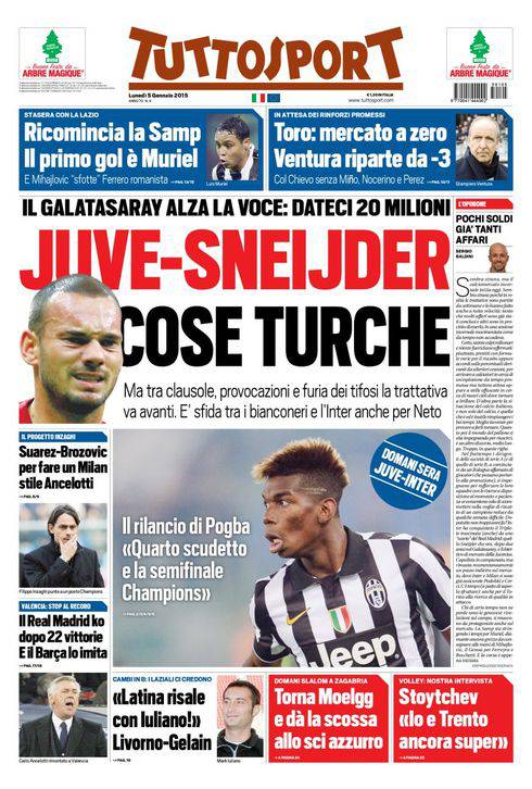 Tuttosport parla della Juventus che vorrebbe avere Sneijder ma il Galatasaray chiede 20 milioni di euro per la cessione dell’olandese.