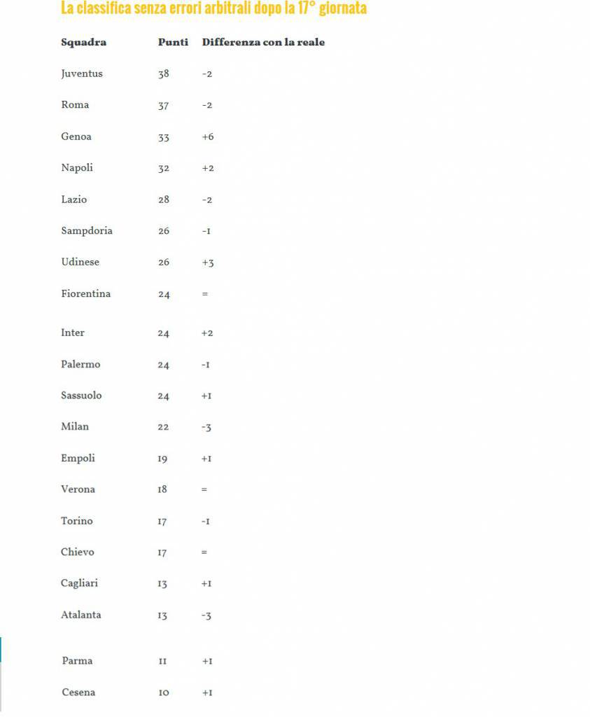Ecco la classifica senza errori arbitrali ricostruita da Panorama.it.