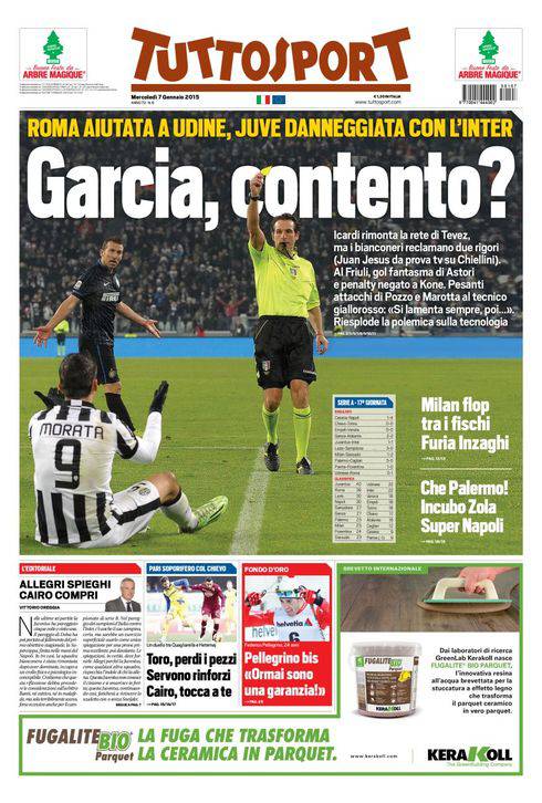 Tuttosport alza la voce contro la Roma aiutata a Udine parlando anche dei due rigori non dati alla Juventus contro l’Inter.