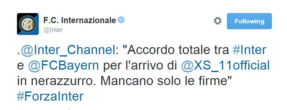 L’Inter ha preso Xherdan Shaqiri dal Bayern Monaco. La trattativa si è conclusa pochi minuti fa con i nerazzurri che a breve daranno l’annuncio ufficiale con un comunicato. Il giocatore, stando a quanto affermato da Sky, arriva in prestito con obbligo di riscatto. I nerazzurri verseranno immediatamente nelle casse dei campioni di Germania due milioni di euro, più tredici durante l’estate. Mancini può così sorridere avendo ricevuto i due esterni d’attacco che aveva richiesto appena arrivato sulla panchina del club meneghino. Ecco il tweet del profilo ufficiale dei nerazzurri con il quale annunciano l’arrivo dell’ex Basilea: