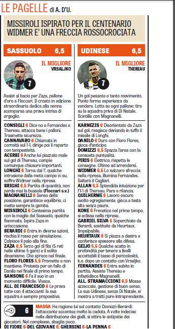 Finisce 1-1 il primo anticipo della 18esima giornata di serie A. Ad aprire le marcature è stato il Sassuolo con Zaza a cui, poco dopo, ha risposto l’Udinese con Thereau. Ma chi è stato il migliore e il peggiore di entrambe le formazioni? Lo stabilisce la Gazzetta dello Sport nelle pagelle. Nella squadra di Eusebio Di Francesco, la palma di migliore in campo va a Vrsaljko, autore di un assist al bacio per Zaza in occasione della rete del vantaggio. Il voto più basso, invece, va a Floro Flores che promette ma non mantiene. Nell’Udinese, invece, il migliore è stato Thereau, non solo per il gol pesante ma per la fiducia che sa trasmettere a tutta la squadra con la sua esperienza. Voto più basso, invece, per Gabriel Silva.