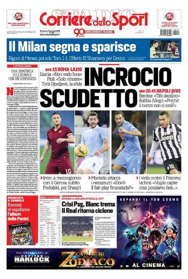Ore 15, Roma-Lazio. Garcia: “Non vedo l’ora”. Pioli: “Solo vincere”. Totto-Djordevic, la sfida. Ore 20.45, Napoli-Juventus. Benitez: “Tifo decisivo”. Rabbia Allegri: “Perché il nostro non ci sarà?”. Inter a mezzogiorno col Genoa: subito Podolski, poi Shaqiri. Montella attacca i nerazzurri: “Dov’è il fair play finanziario?”. Il Milan segna e sparisce.