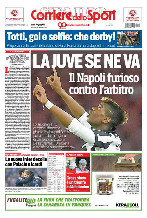 Il Corriere dello Sport parla della Juventus che vince tre a uno in casa del Napoli e vola a più tre sulla Roma.