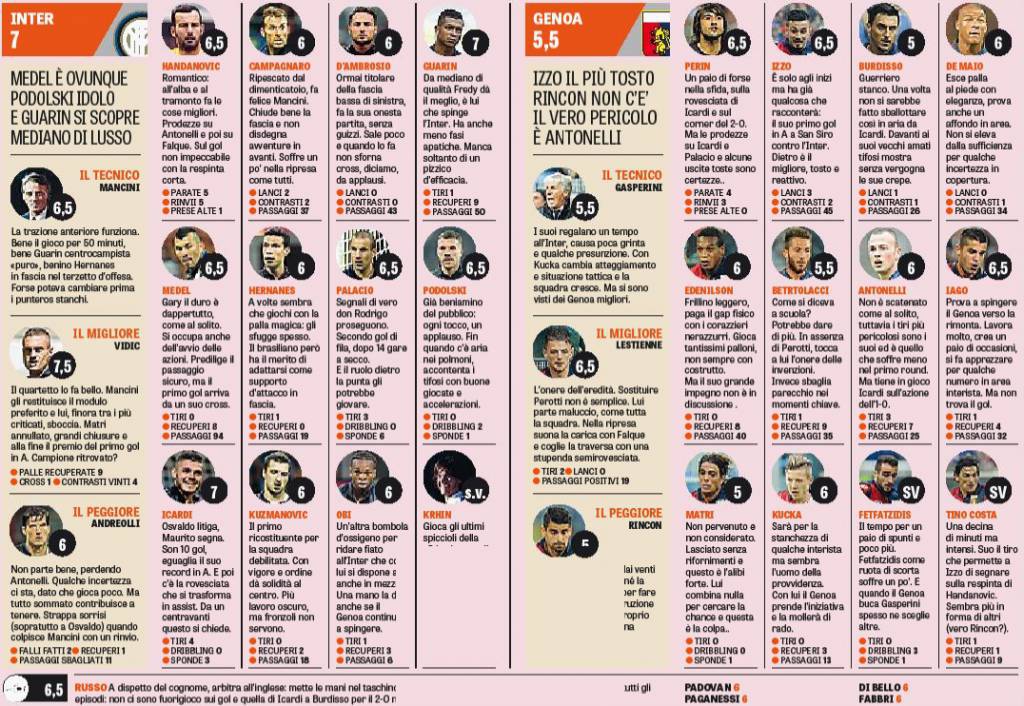 L’Inter vince a San Siro per tre a uno contro il Genoa grazie ai gol di Palacio, Icardi e Vidic, intervallati dal momentaneo due a uno di Izzo, primo gol in Serie A per il giovane talento del Genoa. Migliore in campo il difensore serbo dell’Inter Vidic, autore di un match strepitoso, riportato finalmente nella linea a quattro. Ottima prova anche di Guarin, centrocampista colombiano che ha giocato da mediano davanti alla difesa: bene anche Podolski alla prima a San Siro, grande personalità per il tedesco. Nel Genoa invece steccano Rincon e Matri. Voti e pagelle della Gazzetta dello Sport.