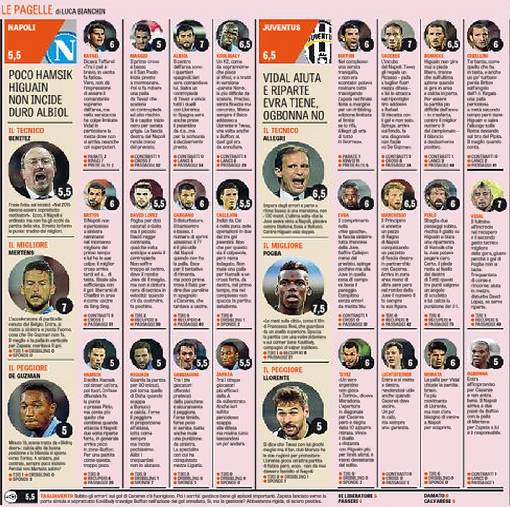 La Juventus vince a Napoli dopo 15 anni, la squadra di Allegri supera quella di Benitez per tre a uno, una prova maiuscola dei bianconeri. In gol per la Juventus Pogba, Caçeres al rientro e Vidal a tempo scaduto, sul due a zero reazione del Napoli con Britos. Grande prova di Paul Pogba, fenomeno francese autore di un gol fantastico, è lui l’uomo devastante di questa Juventus. Non convince Llorente che non sta passando un periodo positivo. Nel Napoli invece grande prova di Mertens, esterno d’attacco belga che è entrato nella ripresa siglando l’assist per Britos: peggiore in campo De Guzman che questa volta non è stato tra i più positivi. Voti e pagelle della Gazzetta dello Sport.