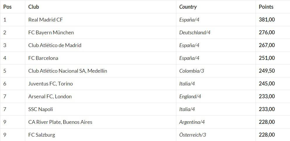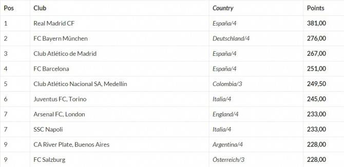 L’Iffhs ha stilato la classifica dei migliori club del 2014 posizionando il Real Madrid, campione d’Europa e del mondo in carica al primo posto. Nella Top 10 c’è spazio anche per due squadra italiane, Juventus e Napoli. Completano il podio Bayern Monaco e Atletico Madrid. La terza italiana in graduatoria è la Fiorentina che si posiziona al 22esimo posto. Crollo Milan che arriva al 159esimo posto.