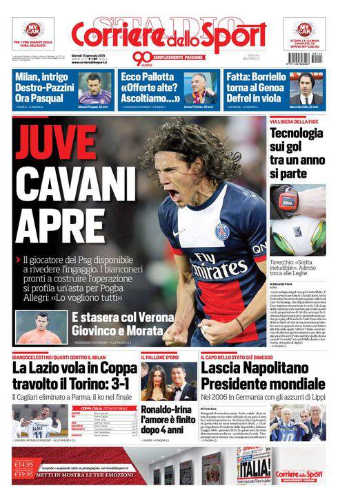 Il Corriere dello Sport parla della Juventus con Cavani che apre al club bianconero pronto a tagliarsi l’ingaggio.